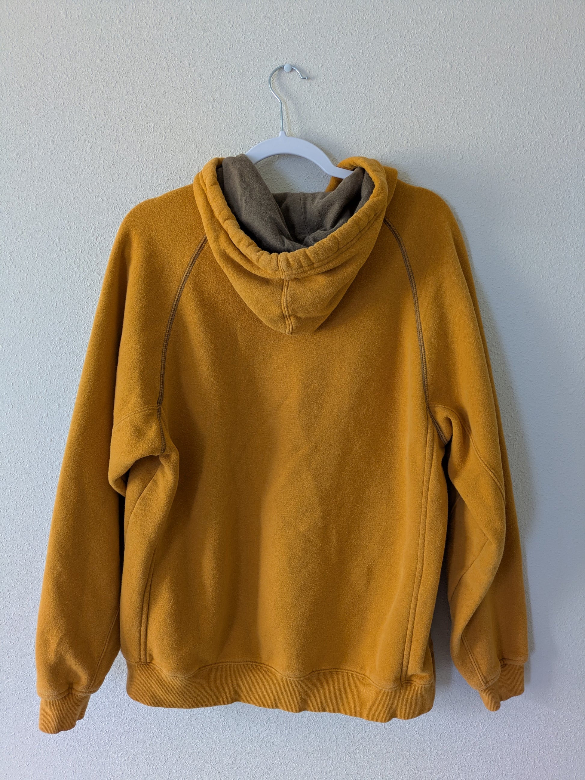 This is a Medium Colombia Hoodie, it's heavyweight and has a brown inner hood lining. The stitching near the sleeves is a silver color that complements the yellow well, it's a really nice color scheme.